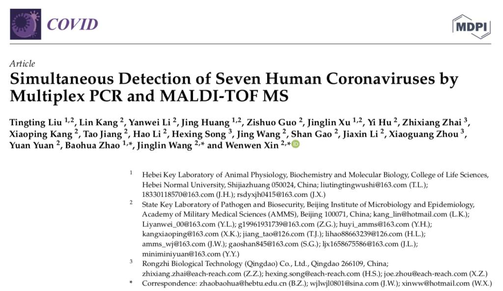 由軍事醫(yī)學(xué)科學(xué)院微生物流行病研究所、河北師范大學(xué)河北省動物生理生化與分子生物學(xué)重點實驗室相關(guān)領(lǐng)域?qū)<依?strong>融智生物科技(青島)有限公司自主知識產(chǎn)權(quán)的核酸質(zhì)譜系統(tǒng),聯(lián)合開發(fā)的可聯(lián)合檢測7種人冠狀病毒的檢測方法,發(fā)表于2022年1月的《 COVID》上。
