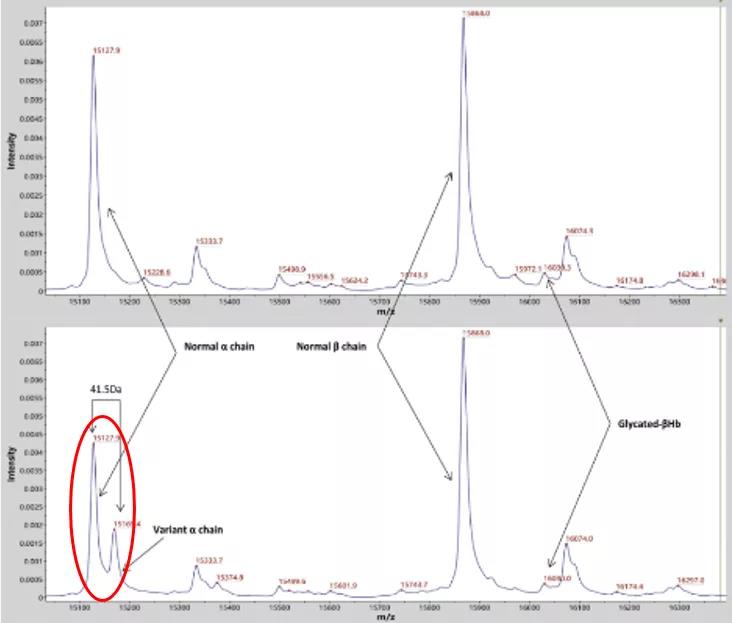 注:上圖為正常人質(zhì)譜圖,下圖為先證者Hb-遼寧質(zhì)譜圖。
