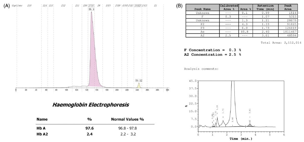 研究團隊又通過毛細管電泳和陽離子交換高效液相色譜法分析Hb[圖2], 未發(fā)現(xiàn)Hb變異的證據,以及正常的HbA2和Hb F。